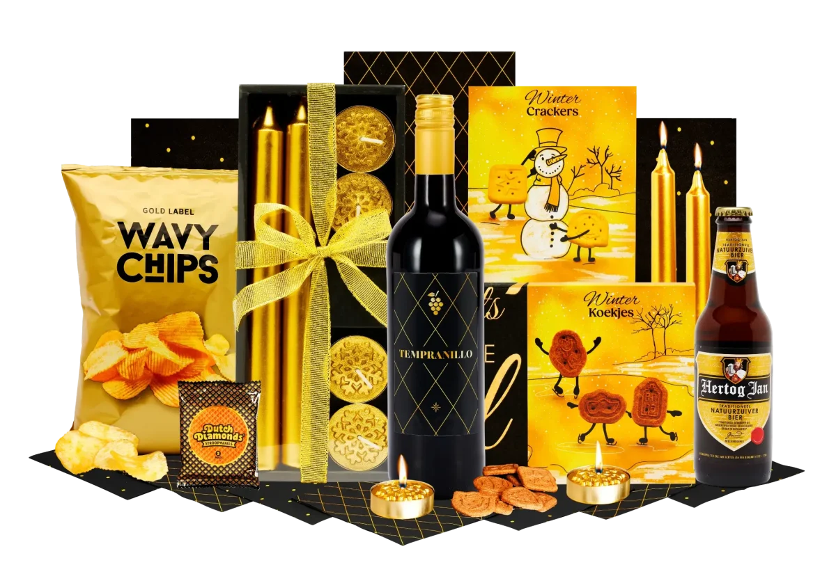 Het Goud feest kerstpakket is de perfecte keuze voor een feestelijke eindejaarsviering. Dit zorgvuldig samengestelde pakket zit boordevol lekkernijen en drankjes die een glimlach op het gezicht van de ontvanger toveren. Het pakket wordt gepresenteerd in een stijlvolle geschenkdoos met strik, die het geheel een luxe uitstraling geeft.