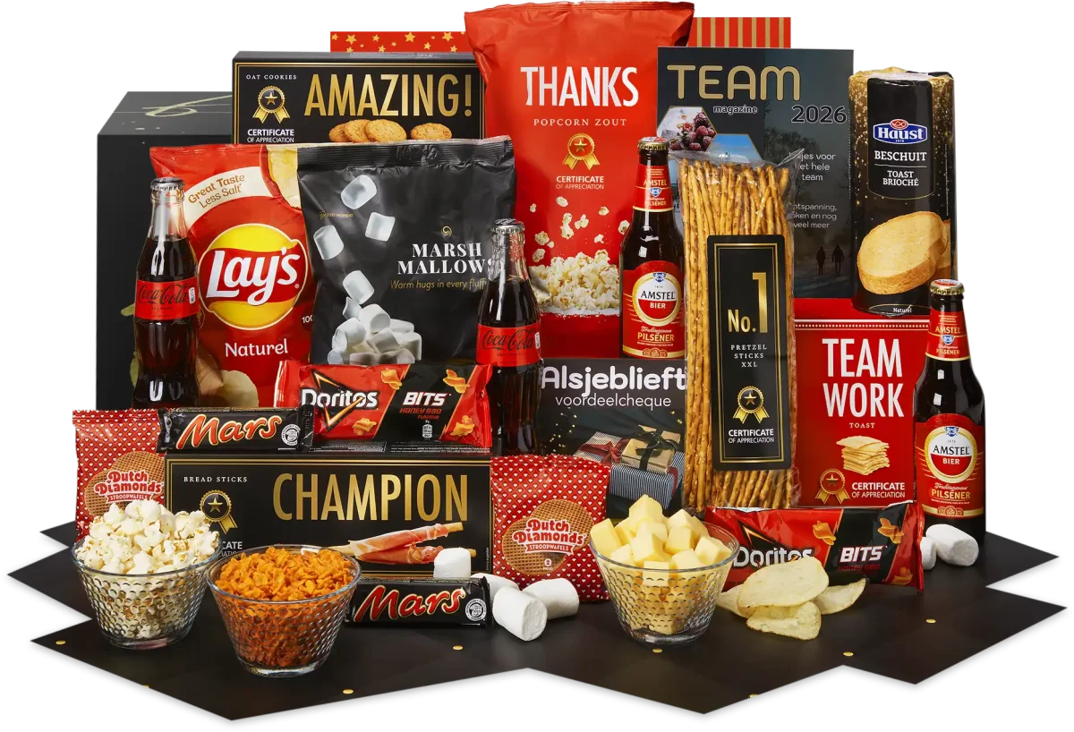 Naast de smakelijke traktaties bevat dit pakket ook handige items zoals de Teamwork Toast 100 gram en Champion Broodstengels 125 gram. Voor de zoetekauw zijn er de Mars singles 51 gram (2x) en Popcorn 125 gram. Dit alles wordt aangevuld met verfrissende dranken zoals Coca Cola Zero fles 20 cl (2x) en Amstel fles 30 cl (2x).